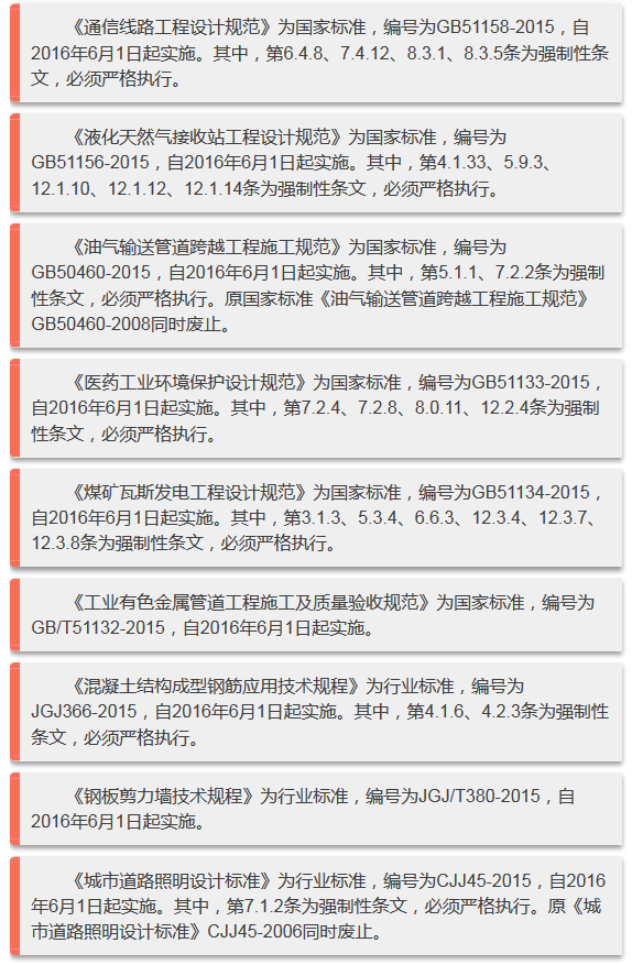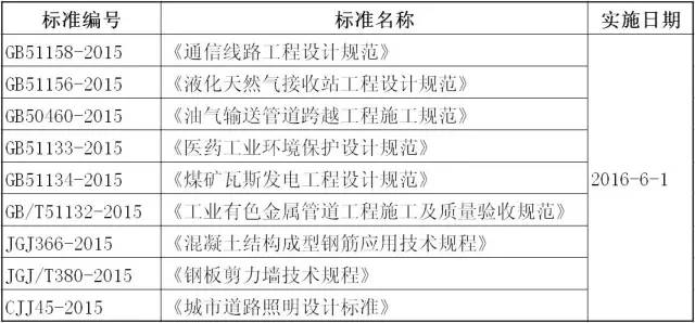 2016年6月實施的工程建設(shè)標(biāo)準(zhǔn)匯總