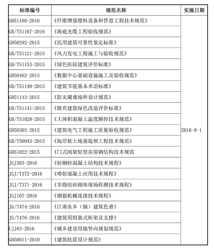 2016年8月實(shí)施的工程建設(shè)標(biāo)準(zhǔn)匯總